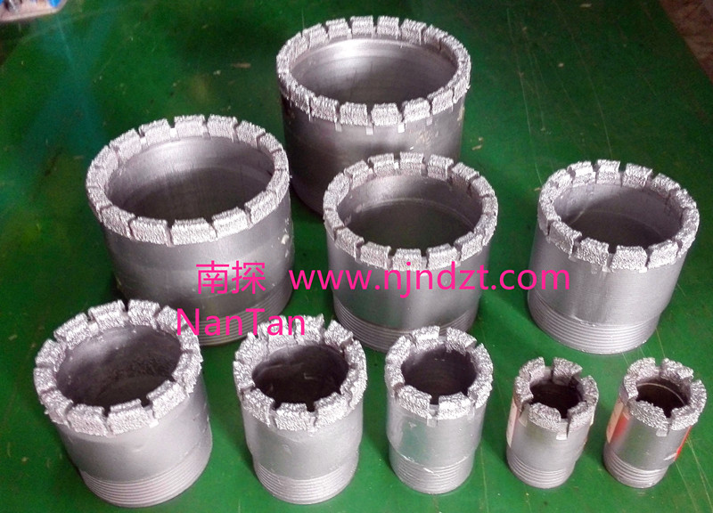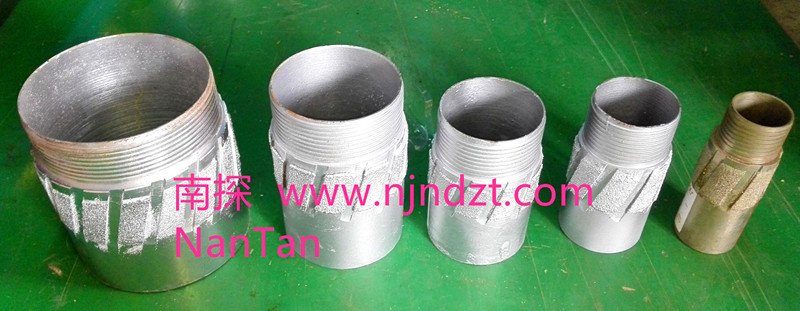 擴孔器(電鍍金剛石):是連接在金剛石鉆頭與巖心管之間,起到擴大孔徑和修整孔壁保證孔徑不縮小的一種鉆具。由于金剛石鉆頭直徑與巖心管外徑的尺寸相差很小,使孔壁與巖心管之間的間隙更加縮小,使過(guò)水受阻,并易造成卡鉆。金剛石擴孔器是一短柱狀管體,上下鋼體部分有絲扣分別與鉆頭和巖心管相連,中間部分是覆蓋含金剛石的胎體,其外徑略大于金剛石鉆頭直徑(2毫米左右),胎體側表面上有過(guò)水水槽,使水流通過(guò)。在極堅硬易磨性的巖層,也有使用兩個(gè)和多個(gè)擴孔器,除一個(gè)裝在鉆頭的上部以外,其余的間隔地裝在巖心管之間。