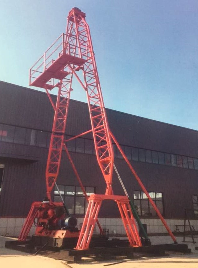 AY-13型鉆塔可配套各種水井鉆機和XY系列巖心鉆機垂直、斜孔的施工。其特點(diǎn)為設計除具有承載能力較大、結構合理、液壓起塔安全可靠,拆裝、搬運成本低等特點(diǎn)外,最顯著(zhù)特點(diǎn)一是塔腳跨度大(5米),操作鉆機空間大;二是塔身下塔腿連接鉸鏈高于底座底梁2.3米,從而在鉆機左右擺放時(shí)下塔腿不影響鉆機前后移車(chē),鉆機動(dòng)力部分可移至腿支撐內襠中。也使得斜孔鉆進(jìn)和提鉆過(guò)程中天車(chē)、回轉、井孔達到三點(diǎn)一線(xiàn),大大提高了定向井孔施工的精準度及安全。